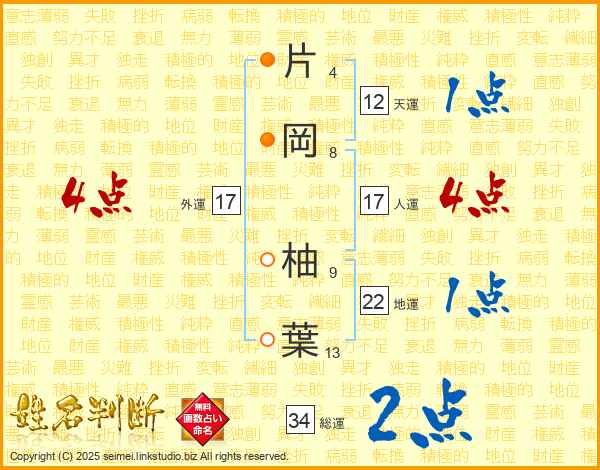片(4画)岡(8画) 柚(9画)葉(13画)