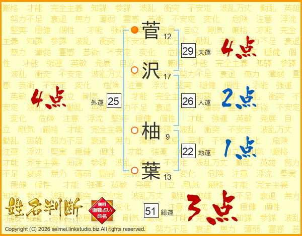 菅(12画)沢(17画) 柚(9画)葉(13画)