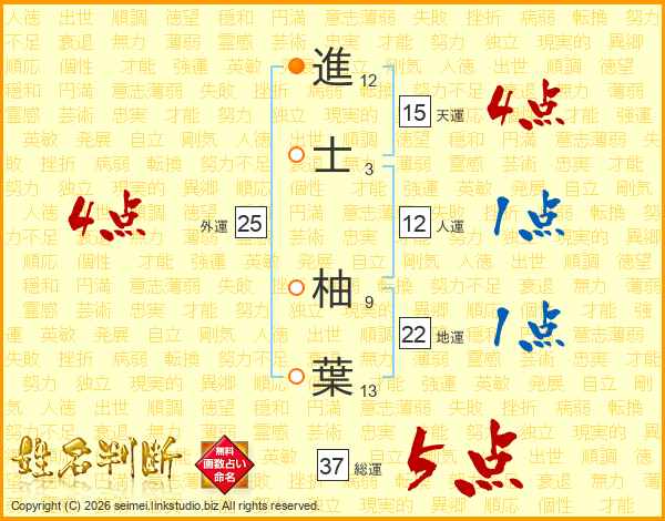 進(12画)士(3画) 柚(9画)葉(13画)