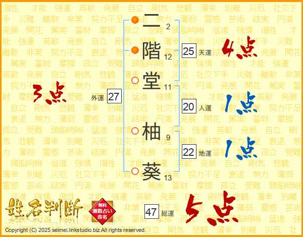 二(2画)階(12画)堂(11画) 柚(9画)葵(13画)