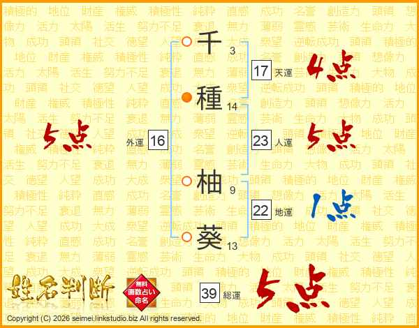 千種柚葵さんの総運は39画の5点!