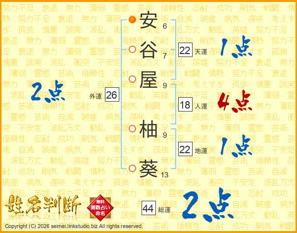 安(6画)谷(7画)屋(9画) 柚(9画)葵(13画)