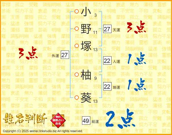 小(3画)野(11画)塚(13画) 柚(9画)葵(13画)