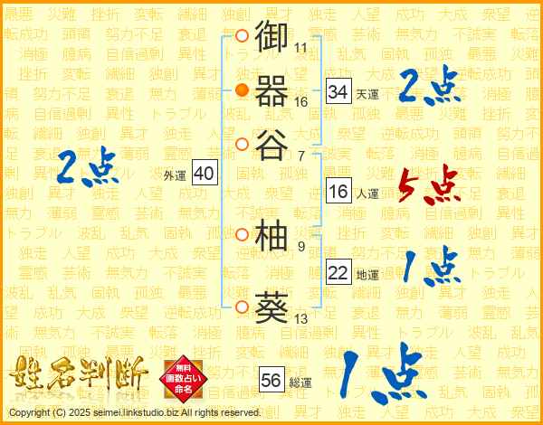 御(11画)器(16画)谷(7画) 柚(9画)葵(13画)
