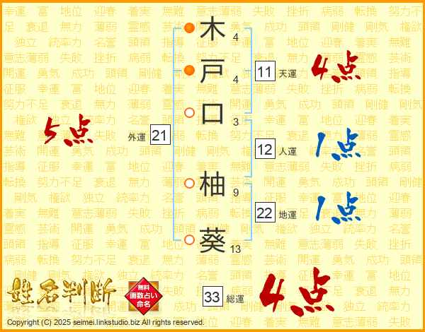 木(4画)戸(4画)口(3画) 柚(9画)葵(13画)