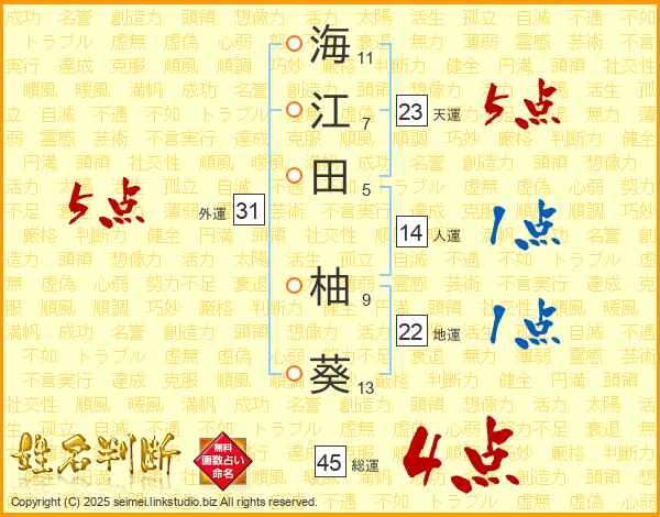 海(11画)江(7画)田(5画) 柚(9画)葵(13画)