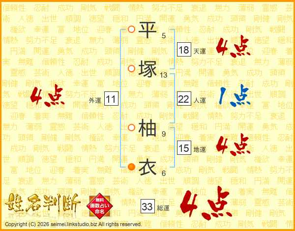 平(5画)塚(13画) 柚(9画)衣(6画)