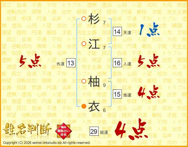 杉(7画)江(7画) 柚(9画)衣(6画)