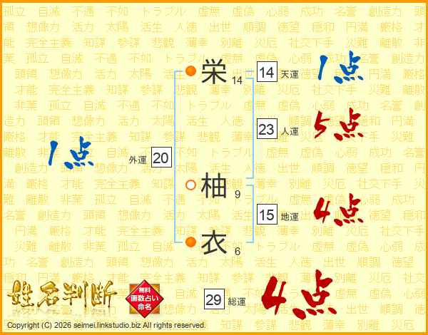 生活面を象徴する運勢です。外部から受ける影響力を表し、結婚運、家庭運や職場、環境への順応性を表します。総運から人運を引いた画数。姓や名が1文字の場合を除く。