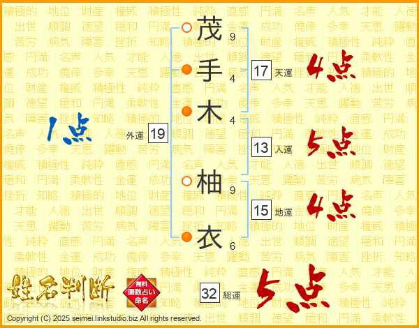 茂(9画)手(4画)木(4画) 柚(9画)衣(6画)