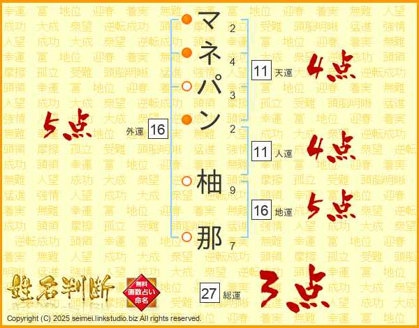 マ(2画)ネ(4画)パ(3画)ン(2画) 柚(9画)那(7画)