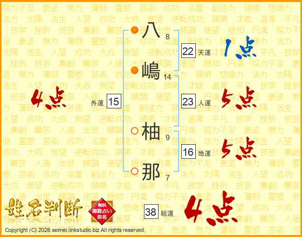 八(8画)嶋(14画) 柚(9画)那(7画)