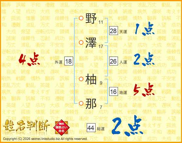 野(11画)澤(17画) 柚(9画)那(7画)