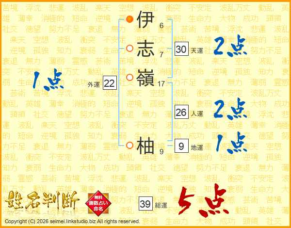 伊(6画)志(7画)嶺(17画) 柚(9画)