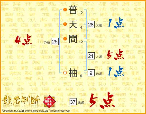 普(12画)天(4画)間(12画) 柚(9画)