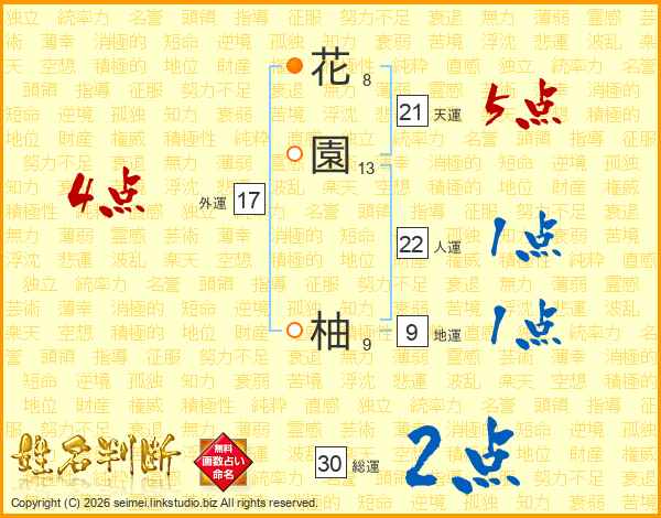 生活面を象徴する運勢です。外部から受ける影響力を表し、結婚運、家庭運や職場、環境への順応性を表します。総運から人運を引いた画数。姓や名が1文字の場合を除く。