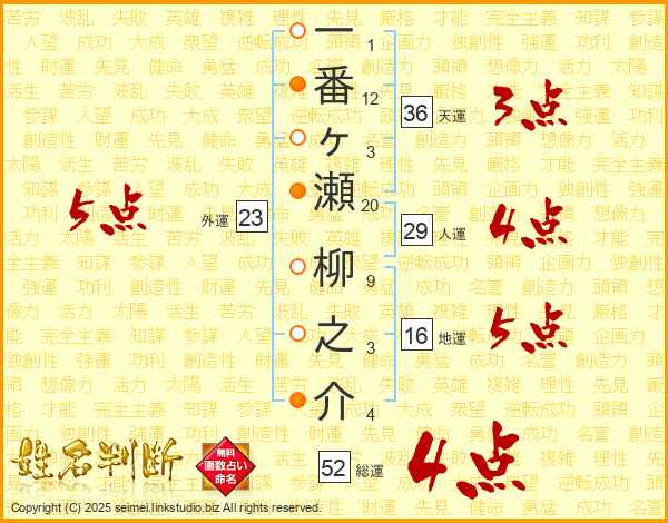 一番ヶ瀬柳之介さんの総運は52画の4点!
