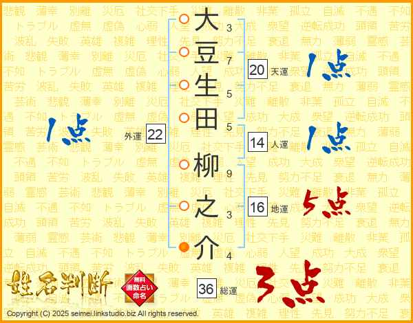 大(3画)豆(7画)生(5画)田(5画) 柳(9画)之(3画)介(4画)