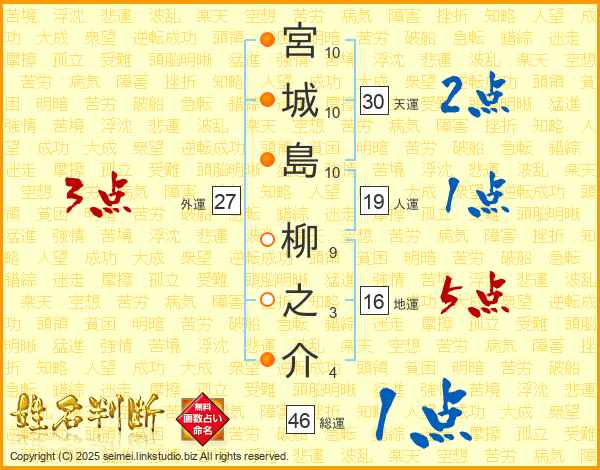 宮(10画)城(10画)島(10画) 柳(9画)之(3画)介(4画)