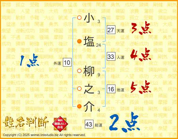 小(3画)塩(24画) 柳(9画)之(3画)介(4画)