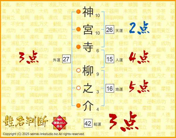神(10画)宮(10画)寺(6画) 柳(9画)之(3画)介(4画)