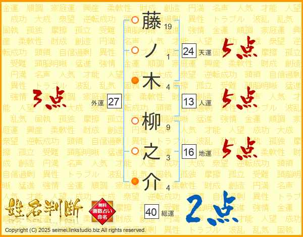 藤(19画)ノ(1画)木(4画) 柳(9画)之(3画)介(4画)