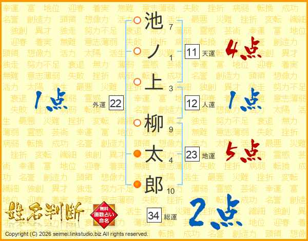 池(7画)ノ(1画)上(3画) 柳(9画)太(4画)郎(10画)