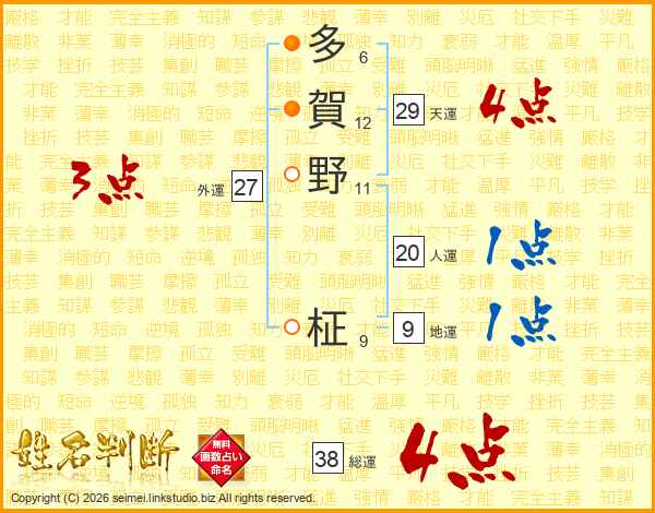 多賀野柾さんの総運は38画の4点!