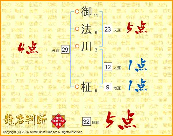 御法川柾さんの総運は32画の5点!