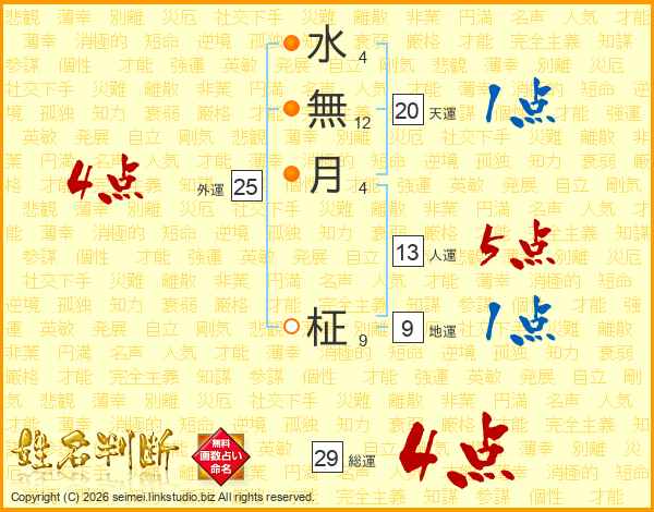 生活面を象徴する運勢です。外部から受ける影響力を表し、結婚運、家庭運や職場、環境への順応性を表します。総運から人運を引いた画数。姓や名が1文字の場合を除く。