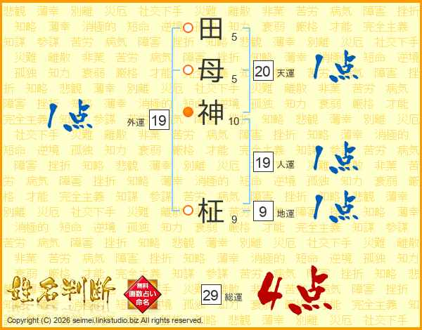 家系が持つ宿命的な運勢を表します。祖先から受け継いだ苗字ですので自分の力が及びません。家柄を象徴します。苗字の合計画数。