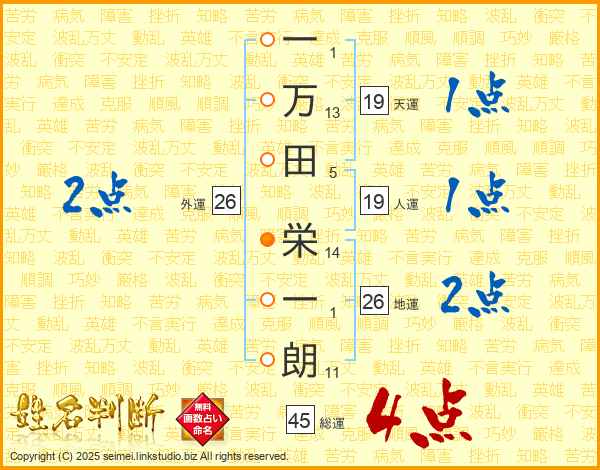 一(1画)万(13画)田(5画) 栄(14画)一(1画)朗(11画)