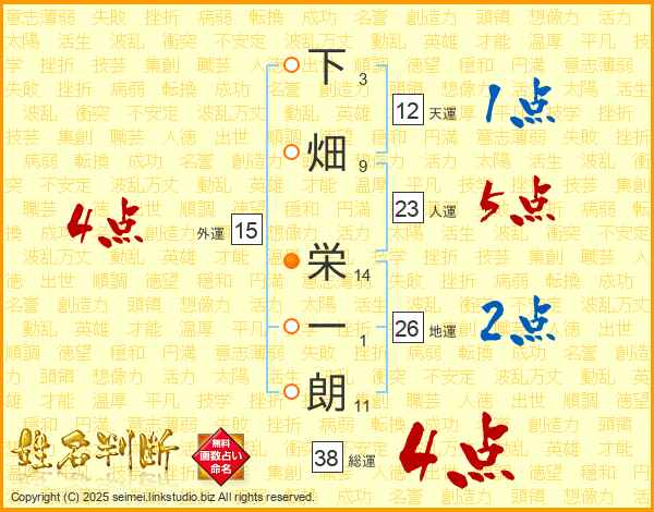 下(3画)畑(9画) 栄(14画)一(1画)朗(11画)