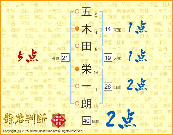 五(5画)木(4画)田(5画) 栄(14画)一(1画)朗(11画)