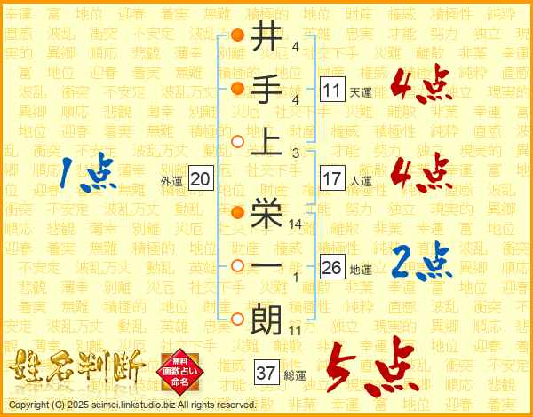 井(4画)手(4画)上(3画) 栄(14画)一(1画)朗(11画)