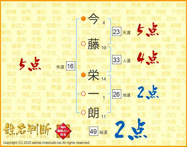 今(4画)藤(19画) 栄(14画)一(1画)朗(11画)