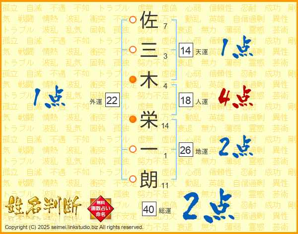 佐(7画)三(3画)木(4画) 栄(14画)一(1画)朗(11画)
