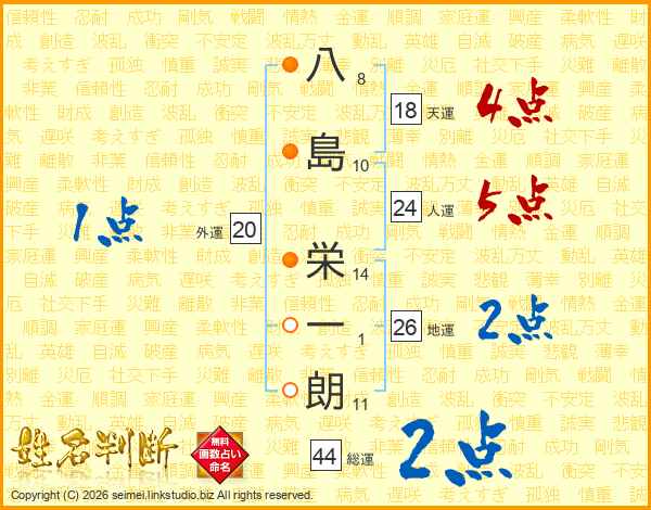 八(8画)島(10画) 栄(14画)一(1画)朗(11画)