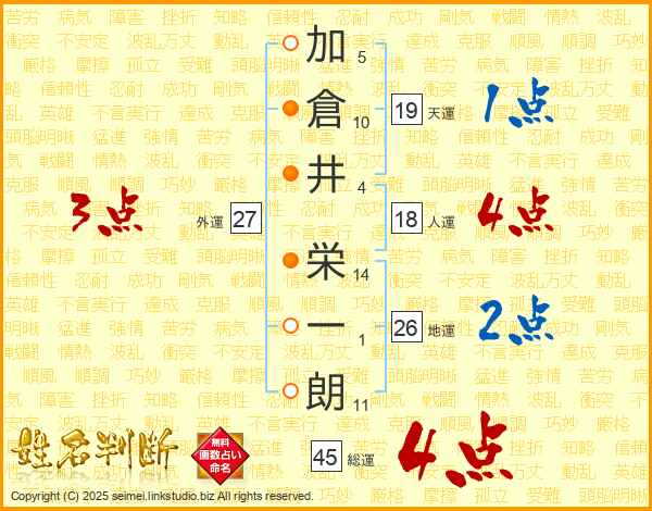 加(5画)倉(10画)井(4画) 栄(14画)一(1画)朗(11画)