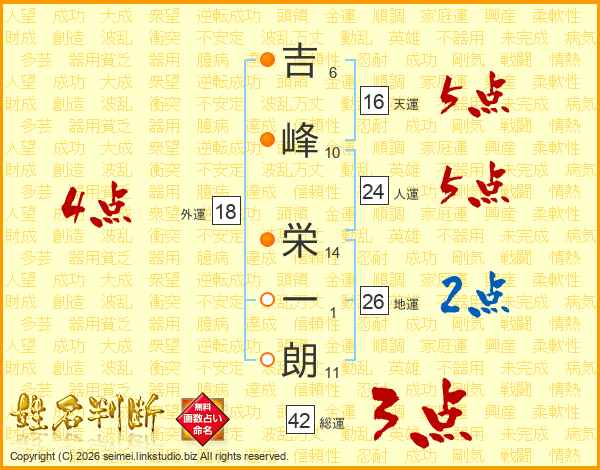 吉(6画)峰(10画) 栄(14画)一(1画)朗(11画)