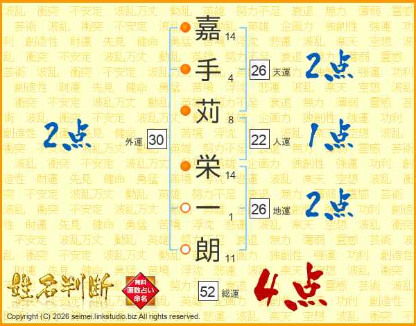 嘉(14画)手(4画)苅(8画) 栄(14画)一(1画)朗(11画)