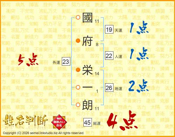 國(11画)府(8画) 栄(14画)一(1画)朗(11画)