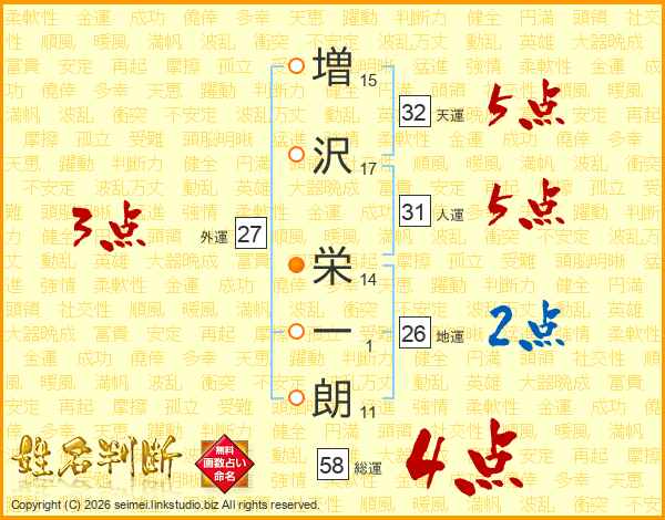 増(15画)沢(17画) 栄(14画)一(1画)朗(11画)