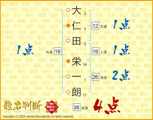 大(3画)仁(4画)田(5画) 栄(14画)一(1画)朗(11画)