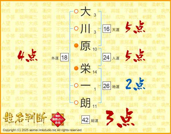 大(3画)川(3画)原(10画) 栄(14画)一(1画)朗(11画)
