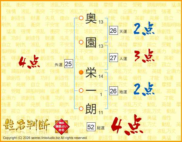 奥(13画)園(13画) 栄(14画)一(1画)朗(11画)