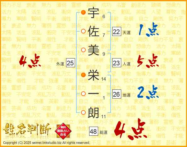 宇(6画)佐(7画)美(9画) 栄(14画)一(1画)朗(11画)