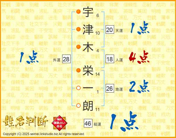 宇(6画)津(10画)木(4画) 栄(14画)一(1画)朗(11画)