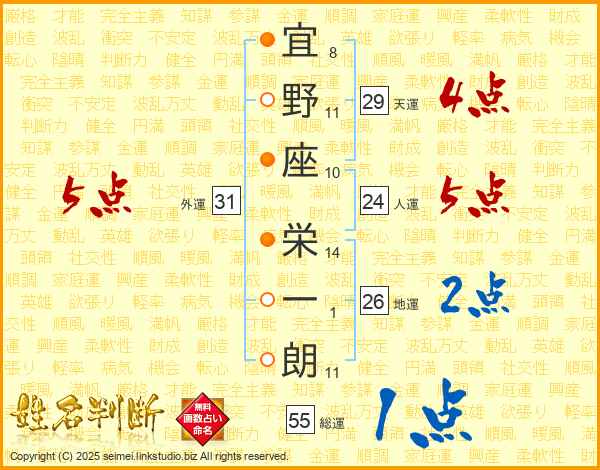 宜(8画)野(11画)座(10画) 栄(14画)一(1画)朗(11画)