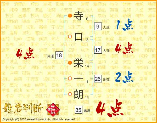 寺(6画)口(3画) 栄(14画)一(1画)朗(11画)